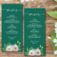 Trae elegancia refinada a su celebración con el menú Boda de Floral blanca verde esmeralda, un diseño fresco y atemporal que combina la riqueza de esmeraldas profundas con la delicada belleza de las flores blancas. El contraste es llamativo pero elegante, creando un aspecto clásico y moderno. Ideal para bodas formales, recepciones en el jardín o cenas sofisticadas, esta carta le da un toque refinado a cada lugar. La tipografía limpia asegura que sus propuestas culinarias sean fáciles de leer, mientras que los acentos florales enmarcan el diseño con encanto natural. Una combinación perfecta de sencillez y sofisticación, este menú es más que una lista - es una expresión cuidadosa del estilo y espíritu de su boda.