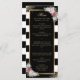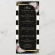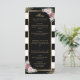 Elegante menú boda floral a rayas blancas y negras con flores rosas negras y vegetación que enmarca los detalles bodas en un marco dorado con un fondo blanco y negro adornado con confeti dorado. Elementos coincidentes disponibles.