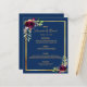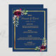 Una elegante carta de boda estilo bohemia. Las plumas y los rosas acuáticos exuberantes en burdeos. Plantillas para los nombres, fecha y menú boda. Marco dorado falso y fondo azul marino de moda. Letras de colores dorados. Fondo azul marino.