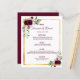 Una elegante carta de boda estilo bohemia. Las plumas y los rosas acuáticos exuberantes en burdeos. Plantillas para los nombres, fecha y menú boda. Marco dorado falso y fondo blanco de moda en la parte delantera, borgoña en la parte posterior. Letras de color burdeos.