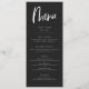 Carta de menú boda minimalista moderna para la cena con letras de boho. El color de fondo está en negro carbón vegetal con textos blancos.