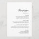 Nuestro moderno menú Minimalista de Bodas en blanco y negro encarna la sofisticación atemporal. Con un diseño limpio, se complementa con la temática moderna. La disposición minimalista garantiza claridad, mostrando los elementos de menú de forma organizada y moda. Aumente su experiencia gastronómica e impresione a sus huéspedes con este delicioso menú que refleja la elegancia contemporánea de su día especial.