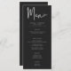 El diseño de este menú boda presenta un tema oscuro y monótono, sencillo pero sorprendente. Un fondo negro oscuro de carbón vegetal es el lienzo perfecto para el texto de la comida boda. En la parte trasera se muestran los nombres de la pareja y la fecha del boda. Único y elegante, este diseño se puede utilizar en cualquier temporada. Creado por Simply Farmhouse Press.