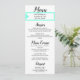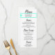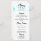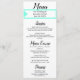 Opciones personalizadas de menú en el frente en el texto negro contra fondo blanco crujiente. Los nombres y la fecha de Boda de la novia y del novio se resaltan en el marco de color turquesa bonito. El reverso tiene iniciales simples de un monograma en azul turquesa. Diseños originales © TamiraZDesigns.