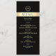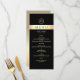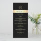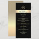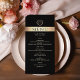 Agregue un toque sofisticado a su mesa de boda con este menú de lujo negro y dorado que presenta un monograma moderno en la parte superior y tipografía elegante en todo. El fondo negro formal, combinado con una banda dorada falsa brillante, crea un look chic y atemporal — perfecto para recepciones de boda elegantes, glamorosas o formales. Totalmente personalizable para reflejar la fecha de su boda, iniciales y selecciones de cena únicas.