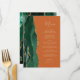 En el extremo izquierdo de este elegante y moderno menú de bodas se encuentra un riachuelo de color verde esmeralda bordeado por un brillo de oro falso. El texto personalizable combina guiones de escritura manual brillantes de color dorado y fuentes de copperplate en un fondo naranja quemado. El reverso presenta un diseño de ágata dorado y verde esmeralda a juego.