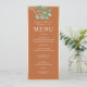 La carta de este boda presenta un diseño rústico y elegante, combinando el encanto boho con un toque botánico. Decorado con vegetación eucaliptos acuáticos y un guión moderno de caligrafía, muestra una paleta de naranjas quemados en terracota y acentos dorados que le aportan un toque sereno y sofisticado a su día especial.