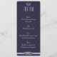 Menú boda náutico con ancla blanca y texto blanco impreso en fondo azul marino con patrón de ancla