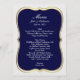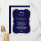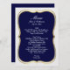 Carta de menú de la recepción nupcial de moda hecha con fondo de papel acuarela blanco, con una zona de texto decorativa con marcos dorados azul marino. El texto del personalizado, en blanco, está listo para personalizar la recepción de tu boda.