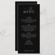 Disfrute de su experiencia gastronómica con la simple tarjeta de menú elegante en negro. Al estar alineadas con el tema boda, estas tarjetas muestran un fondo negro, grabados clásicos en serif y nombres personalizados personalizados personalizados, lo que proporciona una elegante adición a la configuración de la tabla.