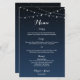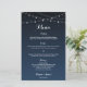 Menú Boda Nocturno Starry Blue de la Marina Celestial. Perfecto para boda de patio trasero al aire libre y boda de temas celestes Para obtener un aspecto coherente, VEA MATCHING ITEMS: https://www.zazzle.com/collections/starry_night_wedding_collections-119114444457820023 PERSONALIZAR ESTE ELEMENTO (1) Para una mayor personalización, haga clic en el enlace "personalizar más adelante" y utilice nuestra herramienta de diseño para modificar esta plantilla. ¡También puedes cambiar el color de fondo! (2) Contácteme si desea algún artículo que no esté disponible en mi tienda.