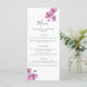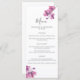 Carta de menú bonito y boda delgada con ramas de orquídeas de color ciruela y letra con letras a mano. En este diseño hay otras piezas de papelería disponibles.