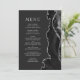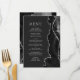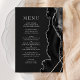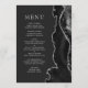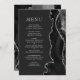 En el extremo derecho de este elegante y moderno menú boda se incluye una barra acuática negra bordeada por un falso purpurina plateado. El texto del personalizable combina el serif romano gris plateado y fuentes de copperplate en un fondo no negro. El reverso presenta un diseño de ágata negro y plateado a juego.