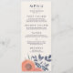 Coloca estas elegantes tarjetas de menú en cada lugar para darle un toque bonito a la recepción de tu boda. Diseño floral moderno en una paleta de color coral y marina de moda con flores de amapola acuarelas en melocotón de coral, con hojas y brotes en azul marino polvoriento y verde cazador descolorido. Agregue sus nombres y fecha de boda a la parte superior. Coordina con nuestra colección de invitaciones a la boda de Peach Poppies. Utilice los campos de plantilla para agregar la información del menú y, a continuación, haga clic en "Personalizar" para cambiar la posición de los elementos si fuera necesario. ¿Necesitas ayuda? Contáctame a través del enlace "Preguntar a este diseñador" en esta página.