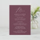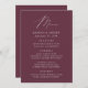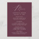 Menú de bodas sencillo y elegante con "Menú" presentado en un guión blanco moderno con fondo morado o color de su elección. Personalice el menú boda morado agregando nombres, fecha de boda e información de menú. Diseñado para coordinar con nuestra colección de bodas Modern Elegance.