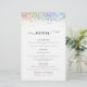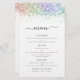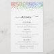 Menú Boda Presupuestario Elegante Purpurina Arcoiris. Un precio económico de 5,5" x 8,5", en una elegante stock de 110 lb LINEN - para un ambiente de lujo a gran valor, es perfecto para menús, así como invitaciones y programas, etc. Esta alternativa de tamaño de presupuesto también está disponible en otras opciones de papel. El material de la tarjeta SEMI-GLOSS de 110 lb es aproximadamente del mismo grosor que una postal, por lo que también funciona bien para las invitaciones. El papel FELT de 100 libras es de color buff, NO blanco, por lo que añade un toque rústico. El material de papel MATTE 80lb es blanco brillante, para impresión crujiente, ideal para menús y programas, mientras que el papel SATIN de 80 libras es delgado y liviano, ideal para gabinetes. Un guión elegante con guiones para el menú de cabecera y un borde purpurina de imitación multicolor en la parte superior de ambos lados en oro. Personaliza fácilmente el resto del texto a tus propios detalles, que incluye alternativas para tus opciones vegetarianas o veganas.