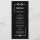 Un moderno menú boda negro con un elegante borde purpurina plateado falso y texto de guión.