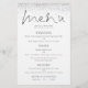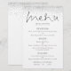 Menú Boda Purpurina plateado con guión elegante de presupuesto. Un precio económico de 5,5" x 8,5", Un diseño elegante, con un guión elegante para el menú de cabecera. Personaliza fácilmente el resto del texto a tus propios detalles, que incluye alternativas para tus opciones vegetarianas o veganas. Un falso borde purpurina plateado recorre el borde superior a ambos lados. También puede cambiar estilos de texto y colores, así como los colores de fondo a través de la opción personalizar adicional si lo desea.
