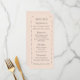 El diseño presenta el formato de menú adecuado para una recepción de bodas elegante o formal. El texto se muestra dentro de un borde precioso y delicado. Reverse presenta un mensaje especial de gratitud de la novia y el novio en una bonita fuente cursiva justo encima de un delicado florecimiento. En el centro, una sencilla cruz de color plateado se representa. Los nombres de la pareja y la fecha del boda se muestran a continuación en una impresión más pequeña. El fondo es rosa champán. También disponible en blanco. Muy formal y elegante. Diseñado para coordinar con la "Suite Boda simplemente católica".