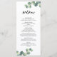 El menú de boda de vegetación de eucalipto botánico rústico es una opción elegante y con estilo para las parejas que buscan incorporar la belleza natural en su recepción de boda. Diseñado con suave vegetación de eucalipto y un tema botánico rústico, esta tarjeta de menú complementa perfectamente las bodas al aire libre, en el jardín o en el bosque. Su diseño simple pero sofisticado crea una atmósfera tranquila y romántica en su recepción, mientras ofrece a los invitados una visión de las deliciosas opciones de comida que vendrán. Personalizable en Zazzle, este menú permite a las parejas personalizar el diseño y los detalles, lo que lo convierte en una hermosa y funcional adición a la decoración de su mesa de boda.