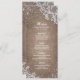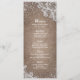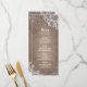 Elegante encaje blanco vintage y brillante purpurina plateado sobre un rústico fondo de burpón. Excelentes menús bodas para boda rústico, boda de granero y boda campestre. Vea todas las piezas coincidentes de la colección.