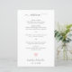 Menú boda moderno con un diseño sencillo y un texto en gris suave con la palabra "menú" en un elegante tipo de letra manuscrita. En la parte inferior hay un corazón rosa pastel con sus nombres y citas. Estos menús baratos de boda con un bonito diseño son un divertido complemento de la recepción y están impresos en hojas de papel para una opción económica.