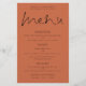 Menú Boda de Terracota con Script Elegante de Presupuestos.Precio económico de 5,5" x 8,5", en un elegante stock de 110 lb LINEN - para un ambiente de lujo a una gran relación calidad-precio, es perfecto para menús, así como para invitaciones y programas, etc. Esta alternativa de tamaño de presupuesto también está disponible en otras opciones de papel. El material de la tarjeta SEMI-GLOSS de 110 lb es aproximadamente del mismo grosor que una postal, por lo que también funciona bien para las invitaciones. El papel FELT de 100 libras es de color buff, NO blanco, por lo que añade un toque rústico. El material de papel MATTE 80lb es blanco brillante, para impresión crujiente, ideal para menús y programas, mientras que el papel SATIN de 80 libras es delgado y liviano, ideal para gabinetes. TENGA EN CUENTA QUE LOS ENVELOPES OPCIONALES SON UN POCO MÁS GRANDES EN TAMAÑO A 6.75" x 9" aprox.Un elegante diseño tipográfico en un fondo de color terracota, con un elegante guión para el menú de cabecera. Personaliza fácilmente el resto del texto a tus propios detalles, que incluye alternativas para tus opciones vegetarianas o veganas. También puede cambiar estilos de texto y colores, así como los colores de fondo a través de la opción personalizar adicional si lo desea.