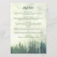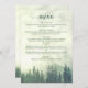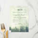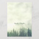 En la carta rústica de boda, el nombre de la caligrafía de un guijarro de langosta y el paisaje montañoso salvaje de pinos verdes envueltos en niebla o niebla. En la parte trasera hay espacio para los nombres de la pareja y la fecha del boda. Ideal para una recepción al aire libre.
