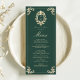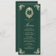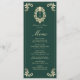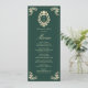 Elegante carta de bodas en verde esmeralda con florituras doradas barrocas ornamentadas y un majestuoso monograma victoriano en la parte superior. Este lujoso diseño ofrece un espacio para mostrar los cursos de boda en un diseño formal y sofisticado. Se coordina perfectamente con la suite de invitados a bodas de color verde esmeralda y barroco dorado, ideal para parejas que planean una celebración clásica, elegante e intemporal.