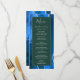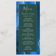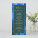 Elegante y moderno menú boda decorado con un fondo de agate azul real de color acuático adornado con un purpurina de imitación plateado. El texto aparece en elegantes letras de color gris plateado y fuentes de copperplate en un rectángulo verde esmeralda. El diseño de agate se repite al revés.