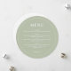 Añada un toque de elegancia moderna a su mesa boda con este menú Boda redondo y moderno de sabores simples. Con un suave fondo verde sabio y un delicado marco de línea blanca, esta carta redonda ofrece un diseño limpio y minimalista que complementa cualquier estilo boda, ya sea que esté planeando un fiesta jardín de primavera, una celebración de playa de verano, una acogedora reunión de otoño o una boda de invierno de moda. La paleta de colores neutros y el diseño hacen que sea fácil emparejarse con una amplia gama de artículos de papelería y decoración boda, especialmente si se compara con otros elementos de la misma colección. Personalizable completo en línea, puede actualizar fácilmente el texto, los tipos de letra y el diseño para que se ajuste a su día especial, sin necesidad de herramientas de diseño ni experiencia. Haga que el entorno de cada huésped se sienta cuidadosamente seleccionado mientras mantiene la presentación de su menú simple, elegante y coherente.