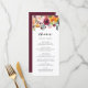 Añada un elegante acento floral a su tablescape de eventos con esta tarjeta de menú floral de personalizable. Tiene acuarelas florales de color naranja, rosa, borgoña y amarilla de flores otoñales con eucalipto y acentos verdes. Personalice esta tarjeta de menú floral acuarela añadiendo sus propios detalles. Esta carta acuarela es perfecta para bodas de otoño o otoño, duchas de novias, duchas para bebés y mucho más.