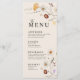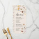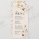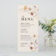 Las tarjetas de menú de boda se caracterizan por el estilo boho, la obra de arte floral y los colores beige, con una mezcla de diferentes estilos de fuente, a menudo en diferentes tamaños, para crear una apariencia única y ecléctica que hace que la estética natural de este menú.