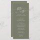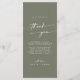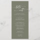 Este boho menú de moda verde oliva es perfecto para un boda minimalista. El estilo bohemio moderno, en tonos tierra verde oscuro, presenta una caligrafía rústica sencilla con un estilo único y clásico. Personalice la parte posterior de su carta de menú con una cuidadosa nota de agradecimiento a sus invitados, amigos y familia.