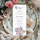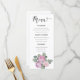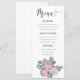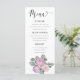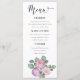 This elegant wedding menu card features romantic script typography paired with soft watercolor florals in blush pink and delicate purple tones. The minimalist layout highlights each course beautifully, while the hand-painted roses and greenery at the base add a timeless botanical touch. Perfect for garden, spring, or romantic weddings, this menu coordinates seamlessly with a purple and pink floral stationery suite for a cohesive reception table setting.