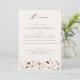 Mejore su experiencia de casamiento con nuestro elegante menú Boda Boho Wildflower. Los menús de 5 horas están imprimidos con elegancia sobre un bonito fondo crema y muestran con gusto el encanto de las flores silvestres, creando el tono perfecto para su elegante celebración de inspiración bohemia. Los detalles exquisitos y los colores floridos de las flores silvestres le dan un toque elegante de belleza natural a las mesas de recepción. Gracias al tamaño de 5 x 7, que ofrece un amplio espacio, su deliciosa selección de menús se muestra con elegancia, asegurando que sus huéspedes disfruten de una experiencia culinaria que se armoniza con el romanticismo de la temporada. Elaborado con meticulosa atención a los detalles y impreso en materiales de alta calidad, nuestro elegante Boda Boho Wildflower Menus sirve como amables keepsakes para sus huéspedes. Añada un toque de encanto extraordinario y elegancia elegante a su boda de otoño, y cree recuerdos duraderos con estos menús de bonito diseño, capturando la magia de las flores silvestres y la alegría del amor de una manera elegante y refinada.