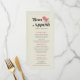 Estos menús bodas de estilo vintage de 4" x 9" incluyen letras negras y salmón con un elegante encabezamiento, "Bon Appetit", en grandes letras negras con acento cardíaco color salmón sobre fondo crema. La carta incluye dos entrantes, dos entrantes y dos postres y los nombres de las parejas bodas.