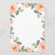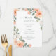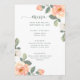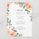Esta bonita carta de boda presenta un melocotón y flores blancas de moda con muchas hojas verdes y una tipografía de escritura moderna sobre un fondo blanco limpio.