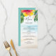 El menú boda temático de las islas tropicales incluye un paisaje marino abstracto con un borde de hojas de palmera acuáticas y una flor de hibisco. El lado inverso es verde mar/azul acuático. Perfecto para el destino, la playa y los temas costeros. Obra de KL Stock.