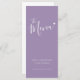 Guión de caligrafía simple y moderno texto silenciado boda de texto morado y blanco menús de cena o menú especial de eventos. Edite este menú de 4 cursos con sus propias palabras. Sencillo pero moderno con un pequeño menú de corazón blanco. Ideal para un simple boda de color morado o para un evento de temática moderna. © Diseño www.mylittleedenweddings.com en zazzle.