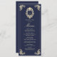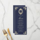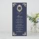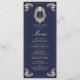 Elegante menú de boda azul marino y barroco dorado con un monograma victoriano vintage, floridos adornos y detalles clásicos de marco. Perfecto para una recepción de lujo, esta plantilla de menú doble muestra un refinado orden de cursos de estilo intemporal. Se coordina con la completa suite de invitados a bodas barrocas y doradas para un aspecto cohesivo y sofisticado.