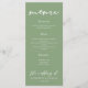 Este sencillo menú de boda verde sabio cuenta con un elegante guión blanco para una ceremonia al aire libre en un entorno natural. Tipografía minimalista sobre verde claro pacífico para un local rústico afuera de un bosque de árboles.