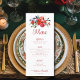 Este magnífico menú para la cena ofrece una hermosa acuarela de flores rojas de poinsettia y hojas de pino para un boda Navidad. Elegante aperitivo personalizado y lista de entradas con un diseño floral bonito de poinsettias sobre sus nombres y fecha boda en rojo festivo.