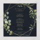 Esta carta geométrica de calligrafía verde dorada para la cena es perfecta para un simple boda. El diseño está decorado con hermosas hojas verdes pintadas a mano en un fondo azul oscuro, adornando un marco geométrico dorado. Este menú se puede utilizar para la recepción de bodas, la cena de ensayo, la ducha de novia o cualquier otro evento.