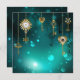 El oro, las llaves antiguas con engranajes y diales cuelgan de las cadenas de oro sobre un fondo verde luminoso.