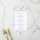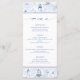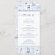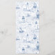 This elegant timeless coastal wedding menu card features a seaside toile de jouy pattern of hand drawn lighthouses, sailboats, and ocean waves, reminiscent of summer on the New England coast.
