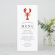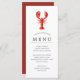 Menús personalizados de comida con tema de Langosta Roja Carmesí para su próxima fiesta de Cocido de Langosta o evento de mariscos. Cuenta con una ilustración de una langosta de estilo acuarela. Debajo de esta hay espacios para la información del menú de su evento.