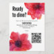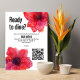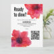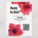 La tarjeta Flat de menú de doble cara con código QR de la "Colección de Bodas Dreamscape Anemone" te ofrece una encantadora y funcional adición a la configuración de tu recepción nupcial. En la parte delantera del cartel, con un fondo blanco y limpio, el título "¿Listo para cenar?" invita a los comensales a unirse a la experiencia gastronómica. Debajo del pie de foto, hay espacio para el texto del personalizable, donde se puede añadir un mensaje o detalles sobre los comedores. Para añadir un toque de elegancia, dos llamativos anémones rojos decoran las esquinas superior e inferior de la parte delantera, complementando el diseño general con vibrantes acentos florales. Al bajar al fondo del cartel, se encuentra una continuación de la elegante presentación. Con un fondo blanco, una sola anémona roja adorna la esquina superior, añadiendo un toque de color y encanto. Debajo, los nombres de las parejas, la fecha de boda y la ubicación del lugar de celebración se muestran de forma elegante, añadiendo un toque personalizado a la tarjeta de menú de doble cara plana. Esta tarjeta de menú de doble cara plana no sólo sirve como guía práctica para la recepción de tu boda, sino que también realza la estética general con sus hermosos elementos de diseño. Forma parte de la completa colección de Bodas Anemone Dreamscape, que ofrece opciones coordinadas de papelería para elevar el ambiente de su día especial.