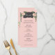Este menú de floración desértica presenta flores rosas y vegetación a ambos lados de una caja negra curvada con la palabra "Comamos". Hay espacio para 5 platos. Se pueden editar todos los detalles del menú. Los colores son verde, rosa, blanco y negro. El nombre de la novia y de los novios aparece en la parte trasera.