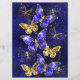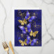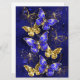 Composición de lujosas mariposas de zafiro y joyas de oro sobre fondo de textura azul.